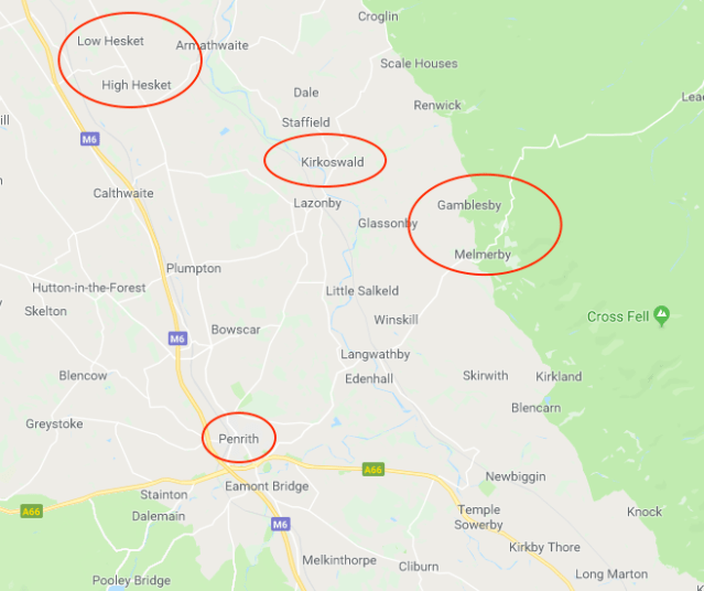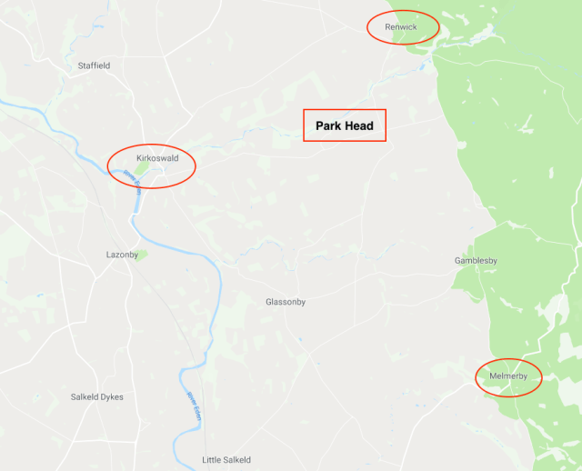 Looking more closely at the Kirkoswald area to see where Park Head and Renwick are, here is a map that shows their geographic relationships. Park Head is so small that it does not merit a place name on the Google map even at this scale so I have added it in.