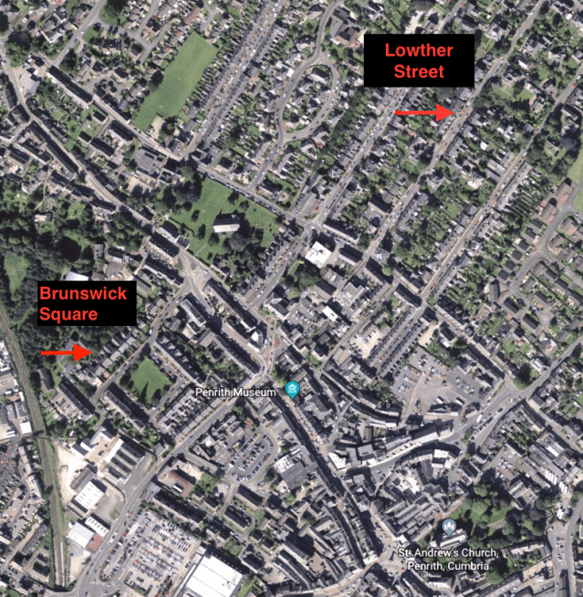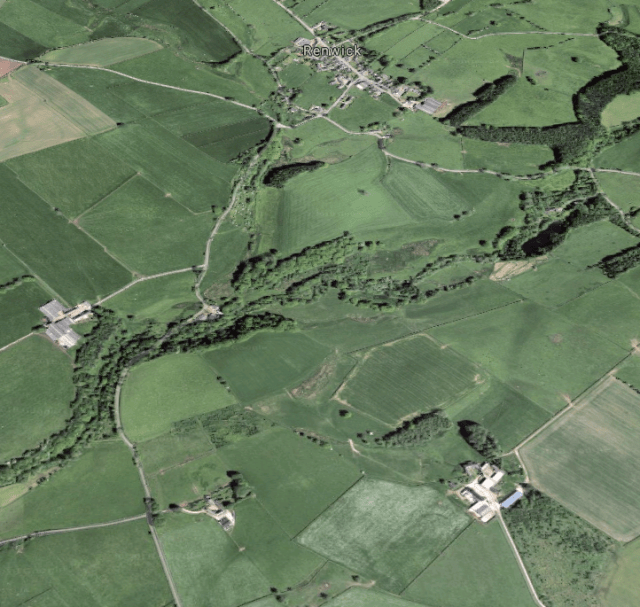An aerial view is also helpful is showing where the farm of Low Huddlesceugh is. Renwick is at the top of the photo and Low Huddlesceugh is at the lower left of the image. The farm with larger buildings to the lower right is what used to be called Huddlesceugh Hall.