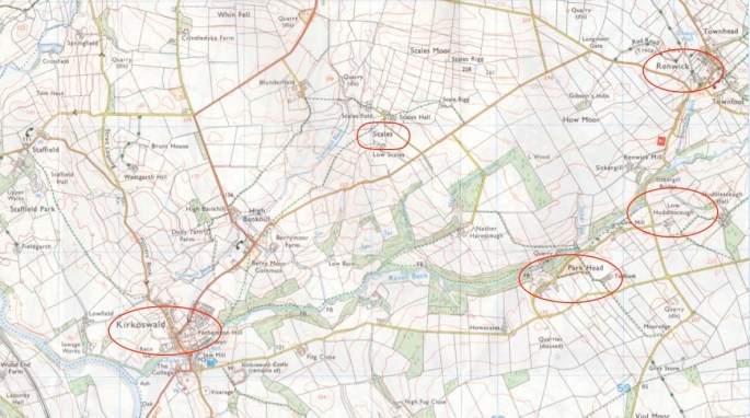 The Ordnance Survey map for the area enables us to see where Low Huddlesceugh farm was (and still is) located, between Park Head and Renwick.