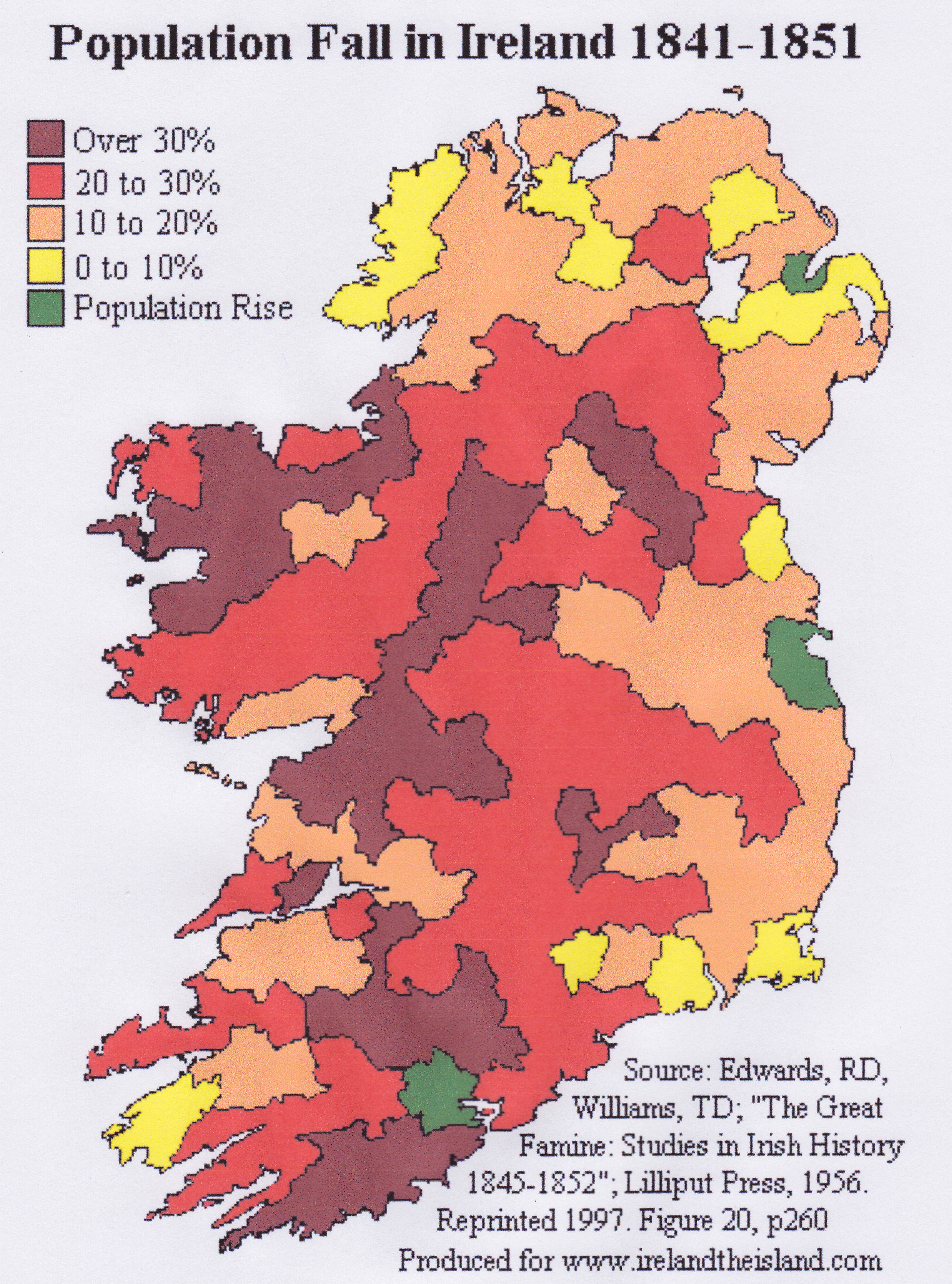 This map shows the uneven effects of the Great Famine on the population numbers across the country. Most of County Tipperary was badly affected (shown as red), losing 20-30% of its population. However some other areas of Connaught and Munster lost over 30% of their people.