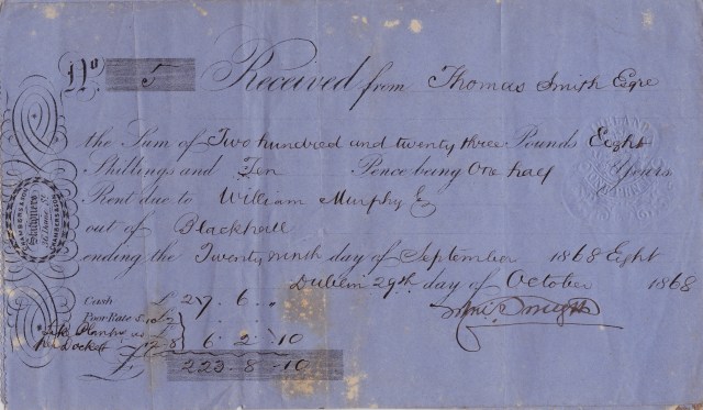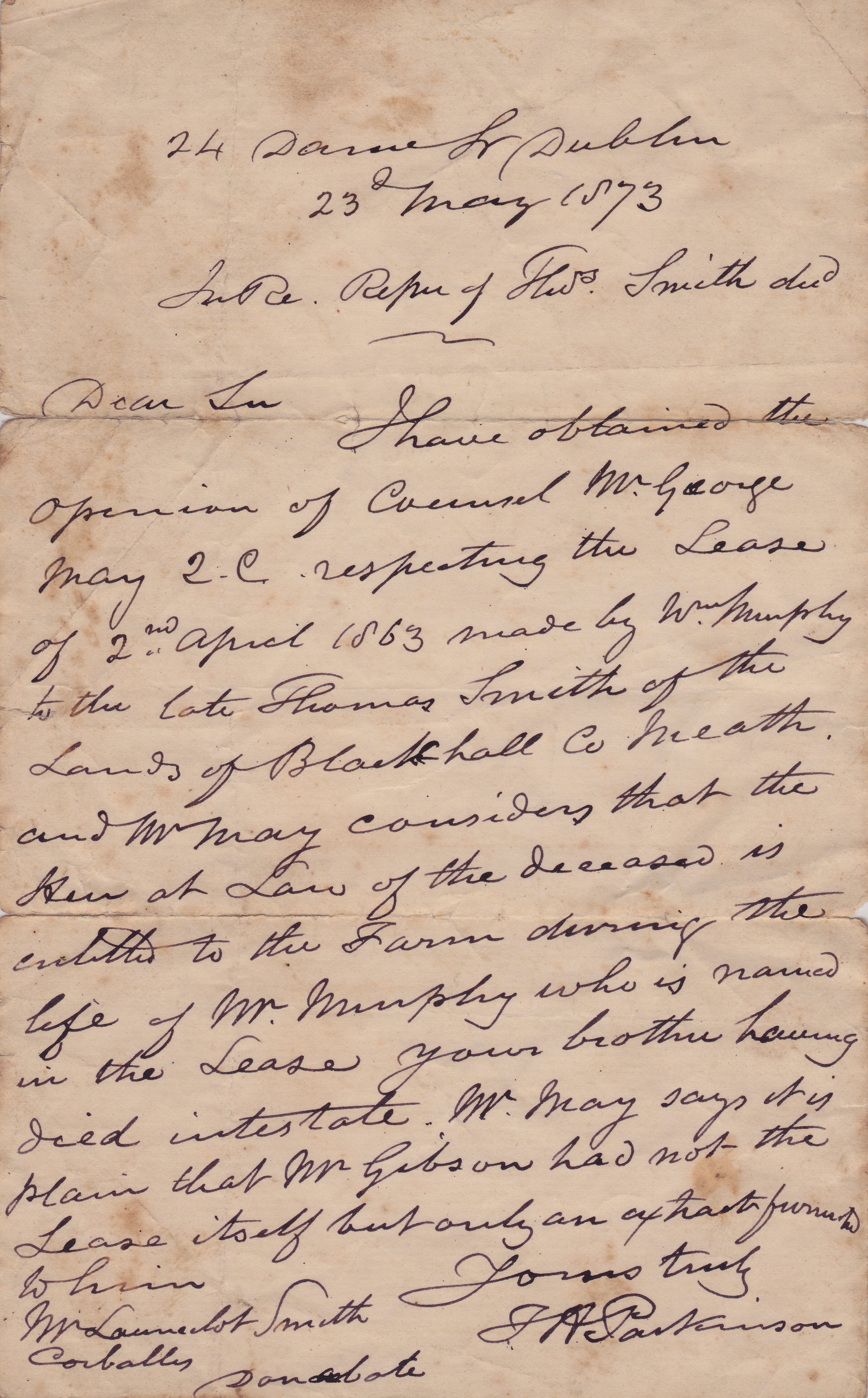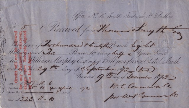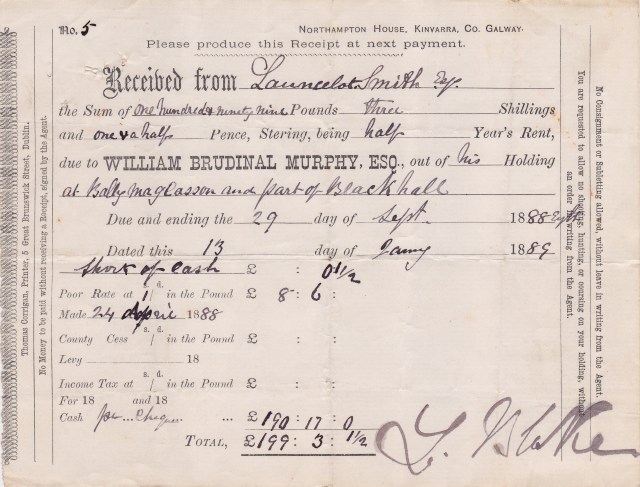 Rent receipts for the Blackhall farm show that, in June 1874, the “Reps of Thomas Smith per Mr. Lancelot Smyth” paid the half-year rent owed of £223 8s 10d to William Murphy of Ballymaglass0n Estate. “L Smith Esq., Rep of Thomas”, was still paying the rent in February 1879. In July 1885, an agent – probably a lawyer – for the Ballymaglasson Estate sent a letter to Lancelot Smith saying the farm at Blackhall was now “out of lease” and he must give up possession or have a writ issued against him. This meant that William Murphy had died and the lease had expired.