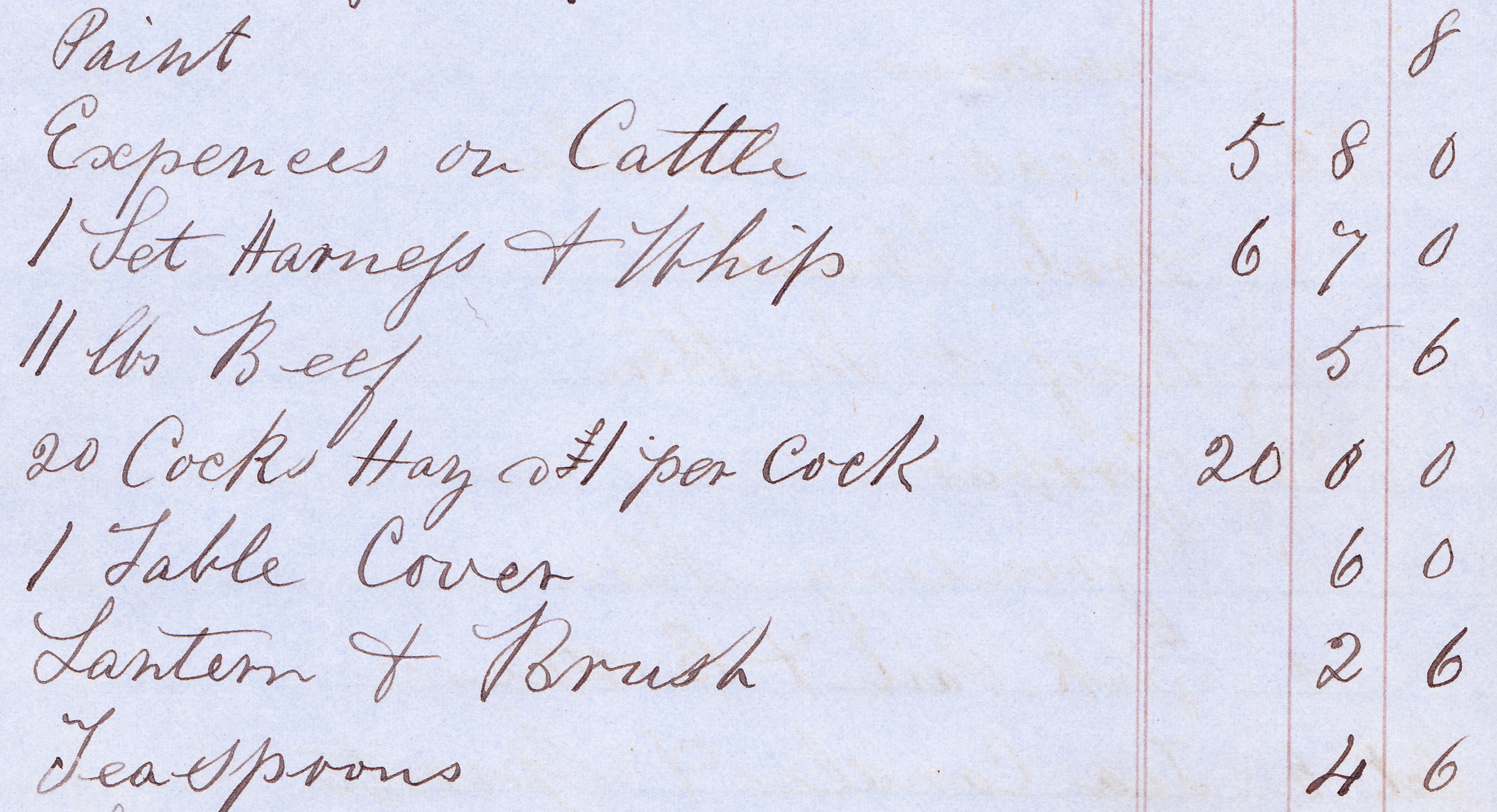In 1863, starting on March 14 and going to the end of December, Thomas Smith’s household expenses totaled £465 9s 10d (about £35,000 today). These expenses included everything from furniture to food and clothing as well as the cost of hay and farm implements. His household expenses could be expected to be higher in the first year as he had to acquire furniture and other goods needed for the house and farm that would not be bought every year.