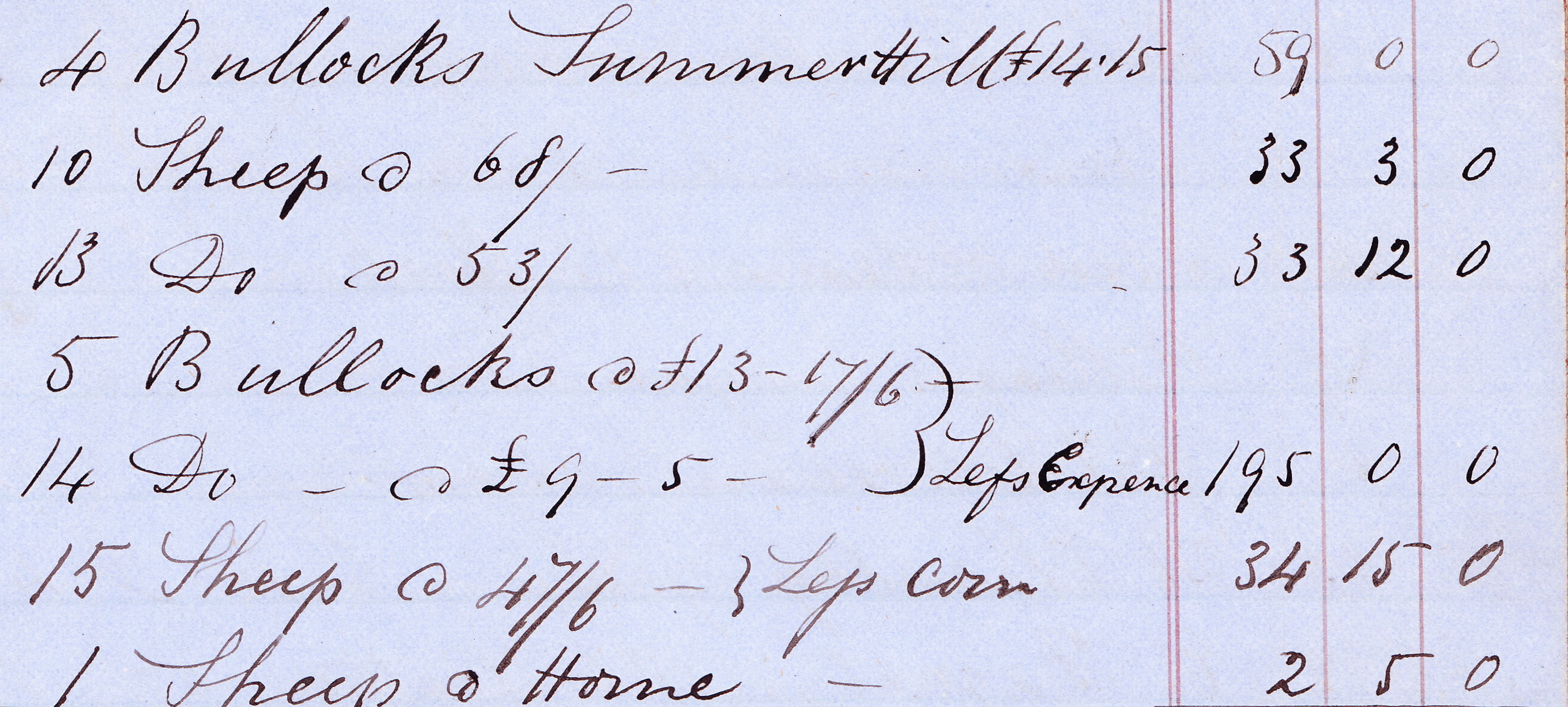 Happily, in 1864 the livestock bought was in the value of £1,892 10s 7d while livestock sold was worth £2,584 1s 8½d for a net profit of almost £700 (that would be about £52,500 in today’s currency). The profit would have easily covered the separate household and labour costs.