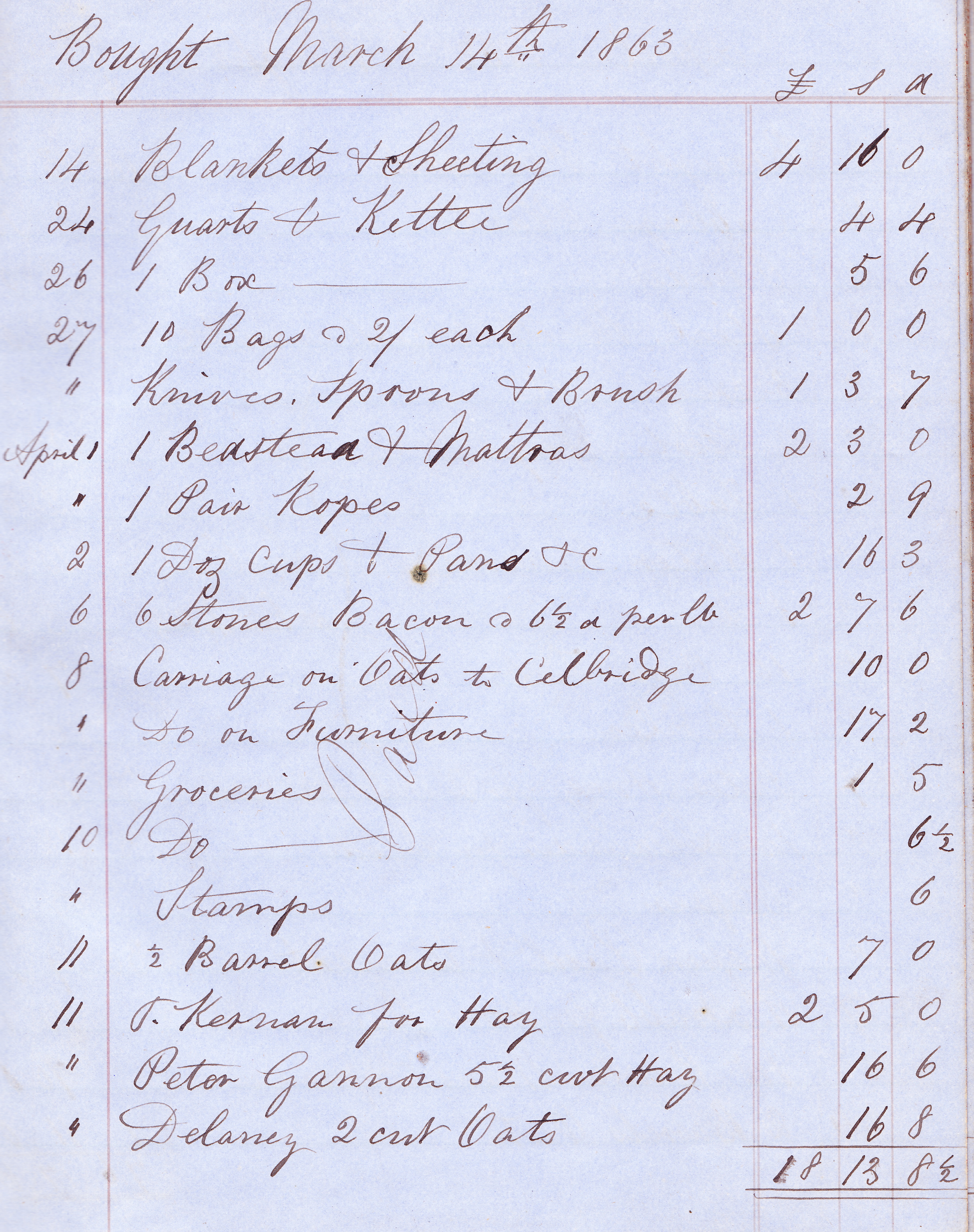 On 14 March 1863 (even before he had moved in to Blackhall), Thomas started to acquire some basic furniture. The expenses began with basic necessities of blankets and sheeting, a kettle, some cutlery, cups and pans, and a bedstead and mattress. The cost of having some furniture delivered was also included. The purchase of 6 stone (84 lbs.) of bacon looks like a good start for many a breakfast.