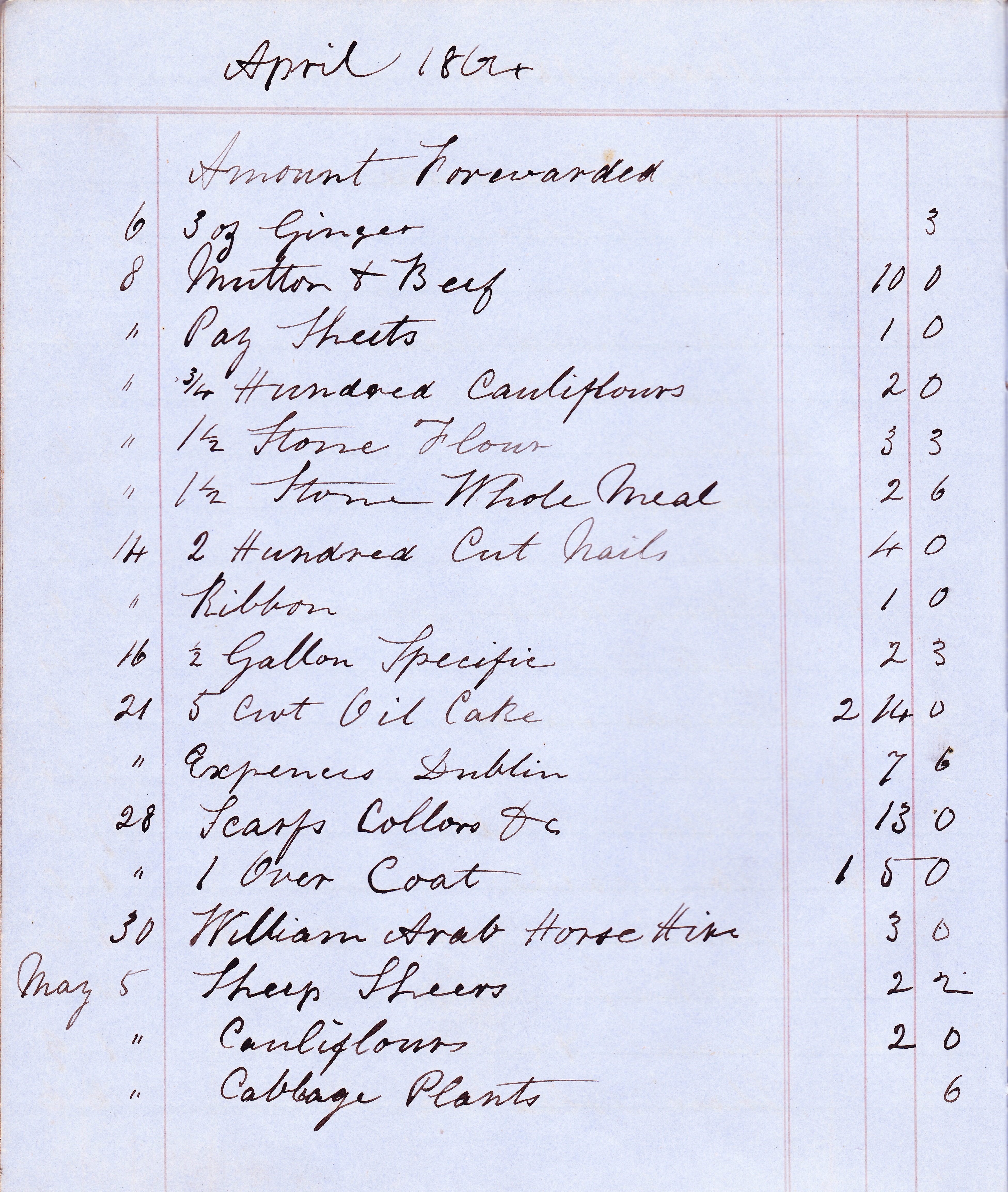 I have found it interesting to see what entries were made in the household accounts and how the items for the house were mixed in with items for the farm operations. It is quite usual to see, for example, an entry for two loads of gravel, followed by groceries, some velvet, a pipe of wine and 21 pounds of beef. Sometimes items that should have been in the livestock section (the cost of carriage for cattle that had been bought) or in the farm labour section (hiring of a ploughman) were listed in the household accounts. Periodically, throughout the household expenses sections, there are entries of “sundries” and “expenses”, some of which are marked as related to traveling to Dublin. I assume most of these expenses were related to travelling to and from livestock sales. On 4 October 1864, the entry was for “expenses Ballinasloe” so Thomas was traveling farther afield to Galway by then. The Ballinasloe horse fair always takes place in October so that was probably where he was going.